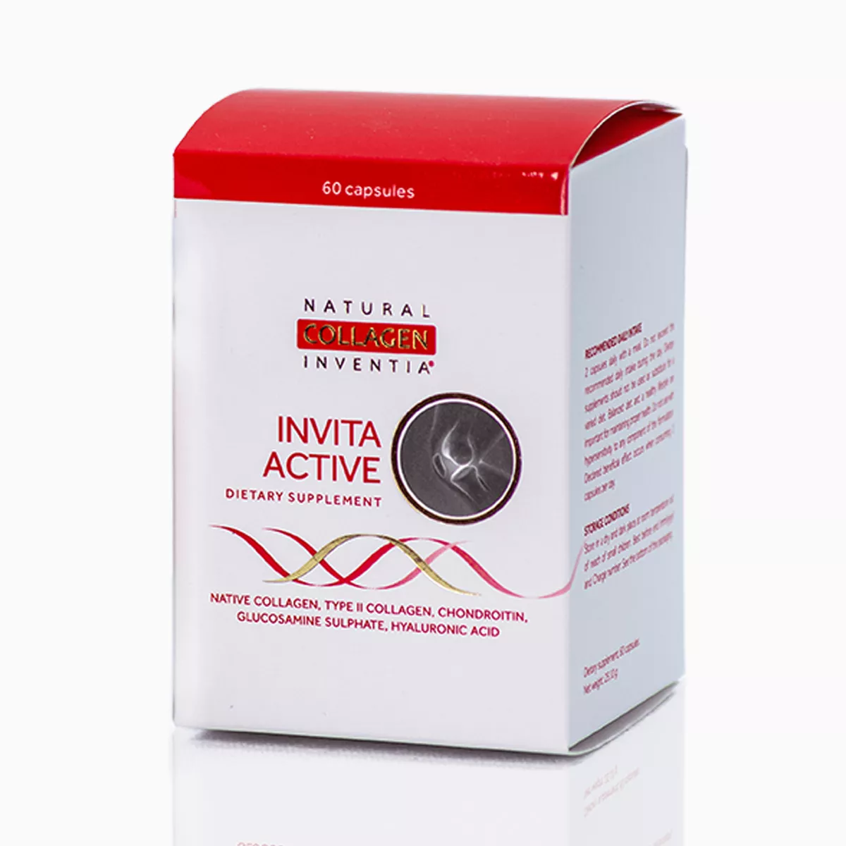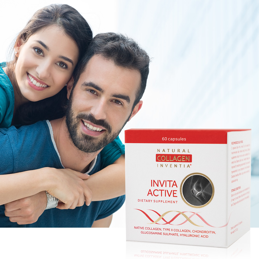 Doplněk stravy INVITA ACTIVE je aktivní podporou pro klouby, vazy a šlachy k udržení kondice. Obsahuje 4 synergicky působící složky: lyofilizovaný hydrát rybího kolagenu třetího řádu se stavbou řetězců alfa 1 a alfa 2 - Přírodní kolagen Inventia® se žraločí chrupavkou a chondroitinem, dále glukosamin, kyselinu boswellovou a kyselinu hyaluronovou. Inovativní lyofilizovaný kolagen obsahuje 80 mg přírodního rybího kolagenu v denní dávce. Je získáván unikátní autorskou technologií hydratace – Triple Helix Formula společnosti Inventia PT (celosvětově uznávaný objev hydrátu tropokolagenu – kolagenu zachovávajícího si cenné struktury trojitých šroubovic, které jsou přirozené pouze pro živé organismy). Tento kolagen se žraločí chrupavkou je zdrojem kolagenu II. typu a chondroitinu vyskytujících se v kloubních chrupavkách.