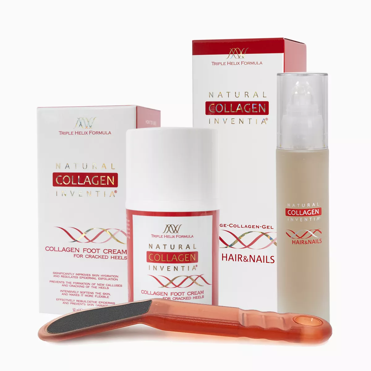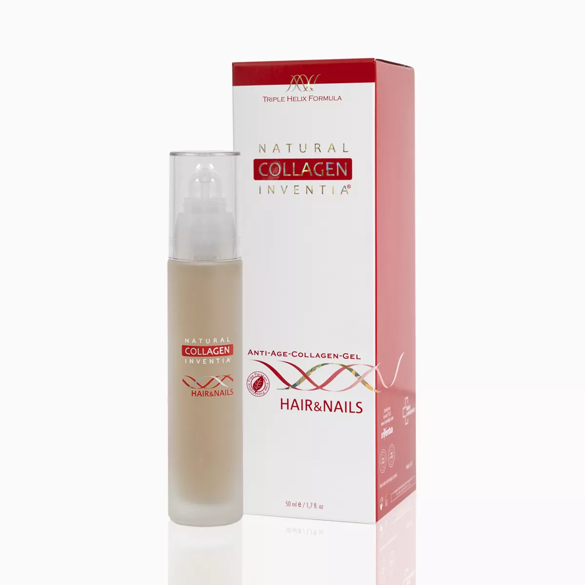 „Živý“ Přírodní kolagen Inventia® HAIR & NAILS – na vlasy a nehty byl speciálně vyvinut k intenzivní anti-age péči o pokožku a všechny typy vlasů a nehtů - zejména jemných, lámavých, suchých, stresovaných a vyžadujících speciální péči. Lze ho používat i do koupele nebo při zpevňující a relaxační kolagenové masáži suchých a zatěžovaných míst na loktech, kloubech, patách, chodidlech a dalších problémových partiích. Tento výjimečný, trojspirální kolagen s klinicky ověřenými účinky posiluje strukturu pokožky, vlasů a nehtů, regeneruje poškozené konečky a snižuje jejich křehkost, lámavost a tendenci k třepení. Vyživuje vlasové kořínky a nehtová lůžka, posiluje je a urychluje jejich regeneraci. Výrazně hydratuje, oživuje a zlepšuje vzhled pokožky rukou, nohou, vlasů a nově rostoucích nehtů. Dodává i řídkým a plihnoucím vlasům viditelný objem, pevnost, pružnost a lesk. Vlasy jsou na pohled zdravější, pevnější a silnější, snadněji se tvarují a účes je trvalejší.