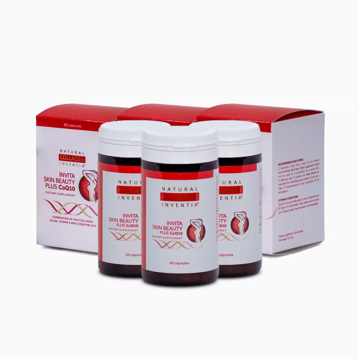 Bioaktivní doplněk stravy Invita Skin Beauty plus CoQ10 – kolagen nové generace v kapslích s jedinečným složením pro udržení krásné a pevné pokožky, pojivových tkání, pružného těla, ohebných kloubů a zdravých vlasů a nehtů. Reprezentuje zcela nový přístup v péči o pokožku a pojivové tkáně lidského těla.